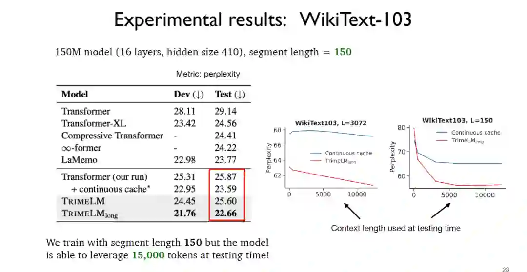 在WikiText-103数据集上进行模型参数150M,切片长度150的测试时,可以看到由于TrimeLMlong在训练阶段针对相同文档的连续片段放入同一批训练,在测试阶段结合了局部记忆和长期记忆,因此尽管切片长度只有150,但是在测试阶段实际可利用的数据可以达到15000,实验效果远远好于其他基线模型。