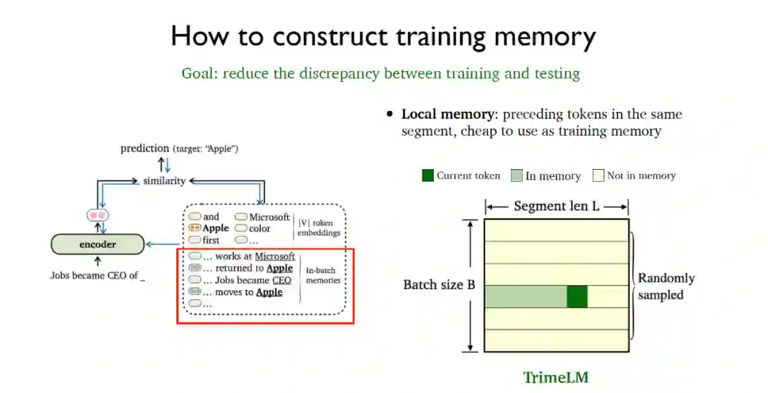 指的是在同一个数据片段中的先前标记(tokens),使用代价极其低廉。可以采用随机取样的批处理方式就能直接在训练阶段和测试阶段同时利用局部记忆,这就得到了基于局部记忆的基础版TrimeLM模型。