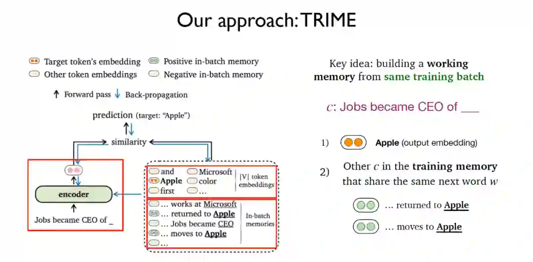 ,主要思想是针对相同的训练批(training batch)构建一个工作记忆(working memory)。针对给定文本预测下一个单词的任务,TRIME的思想与对比学习十分类似,不仅仅考虑利用softmax词嵌入矩阵预测下一个单词出现概率的任务,还新增了一个模块,在这个模块中考虑所有出现在训练记忆(training memory)中且与给定文本需要预测的单词相同的所有其他文本。