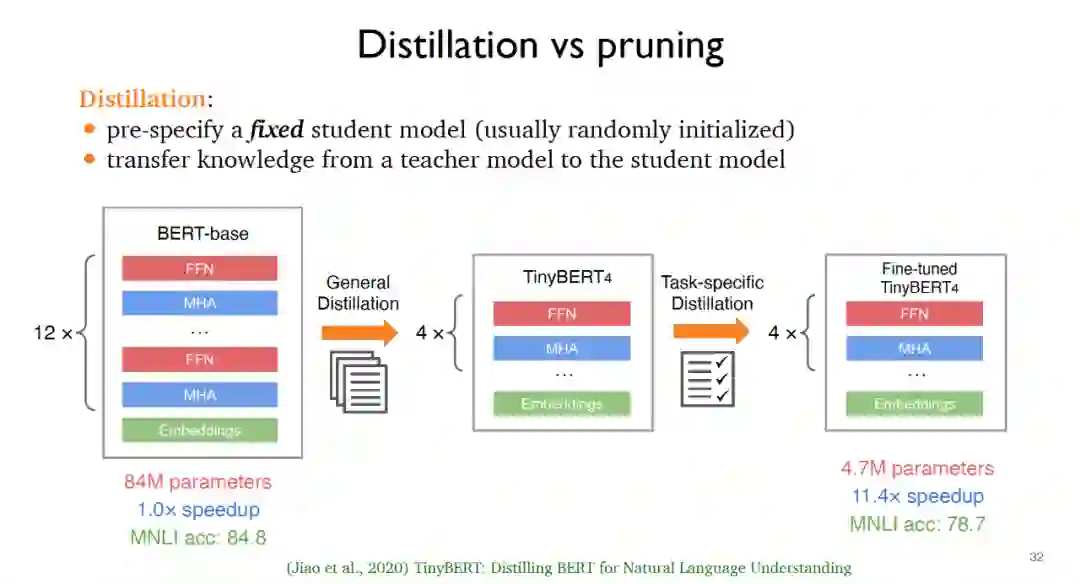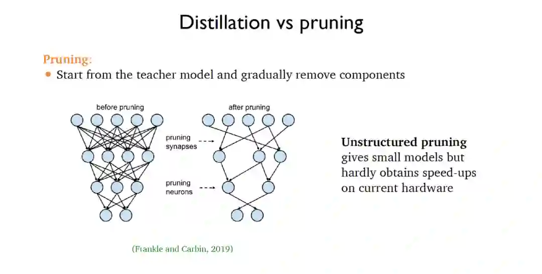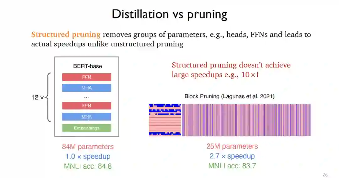 对于剪枝而言,往往需要从一个教师模型出发,然后不断地从原始模型中移除不相关的部分。在2019年提出的非结构化剪枝可以得到更小的模型但是在运行速度方面提升很小,而结构化剪枝通过移除例如前馈层等参数组实现实际应用的速度提升,例如2021年提出的块剪枝可以实现2-3倍的速度提升。