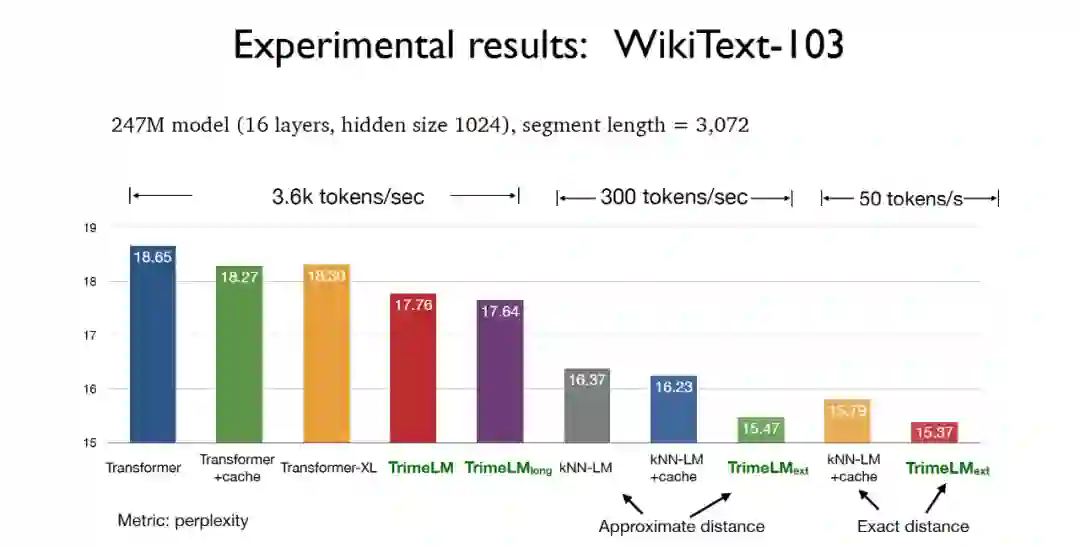 (perplexity)效果,其中基于实际距离的TrimeLMext模型可以取得最好实验效果。同时TrimeLM和TrimeLMlong也能保持和传统Transformer 接近的检索速度,同时兼具了困惑度和检索速度的优势。