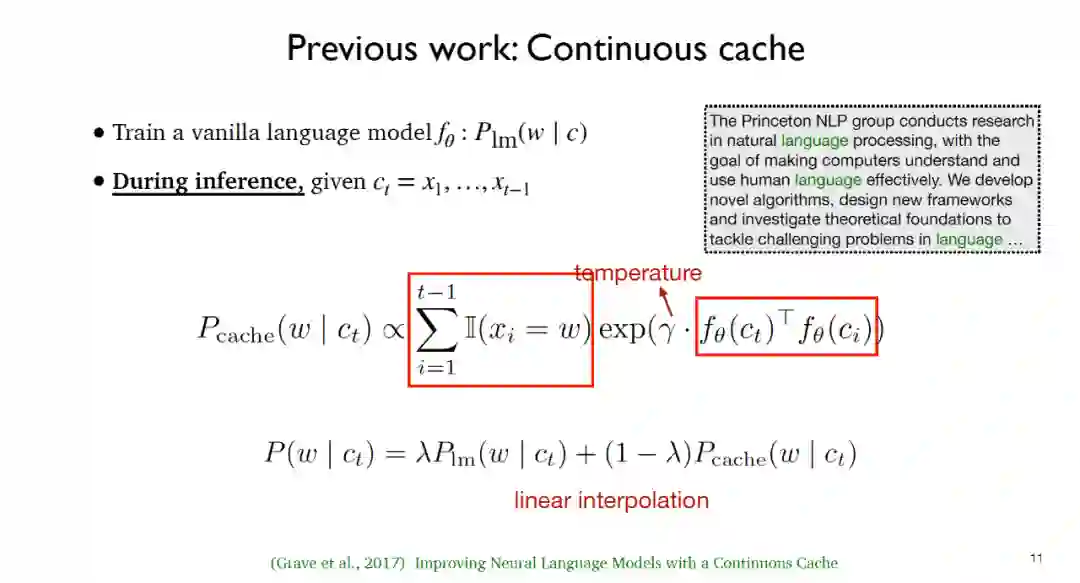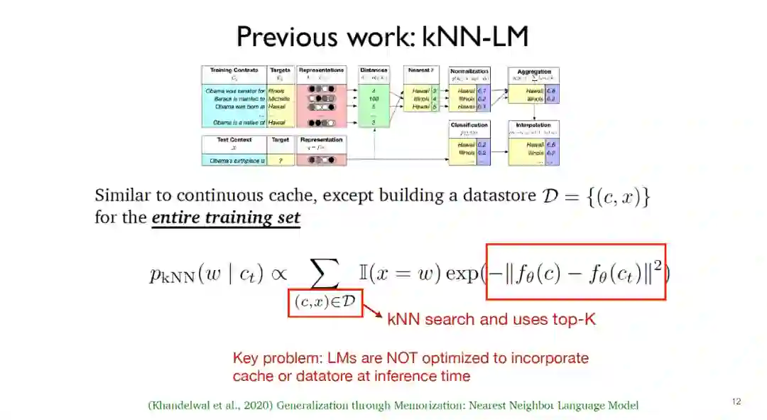 上述两个工作实际上只是在测试阶段采用了缓存分布和k近邻分布,在训练过程中只是延续了传统的语言模型,在推断阶段语言模型并没有优化缓存和数据存储区的结合。