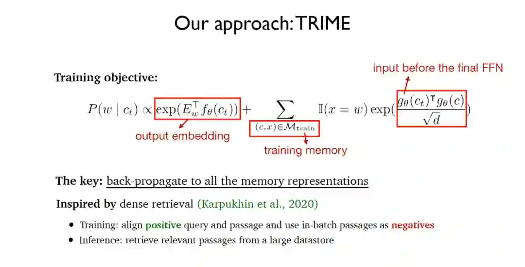 算法希望最终训练的网络能够实现最终预测的单词尽可能准确,同时同一训练批内共享同一个待预测单词的文本尽可能相似,以使得正在训练过程中让所有的文本记忆表示通过反向传播实现端到端的神经网络学习。算法的实现思想在很大程度上受到2020年提出的稠密检索(dense retrieval)所启发,稠密检索在训练阶段对齐询问和正相关文档并且利用同一批内的文档作为负样本,在推断阶段从大型数据存储区中检索相关文档。