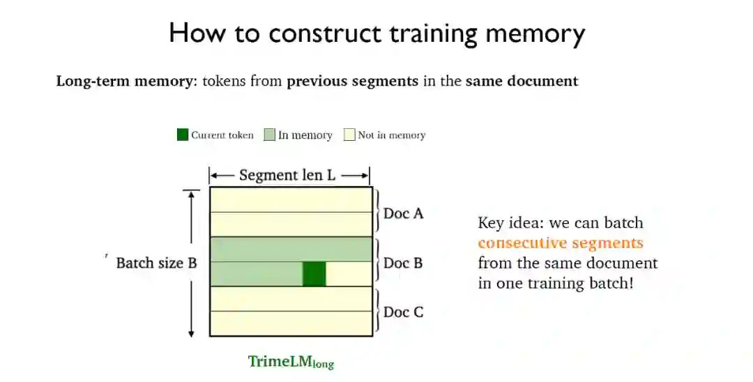 指的是在同一个文档先前片段中的标记,需要依赖于同一个文档的先前片段。为此将同一个文档中的连续片段(consecutive segments)放入同一个训练批中,这就得到了集合长期记忆的TrimeLMlong模型。