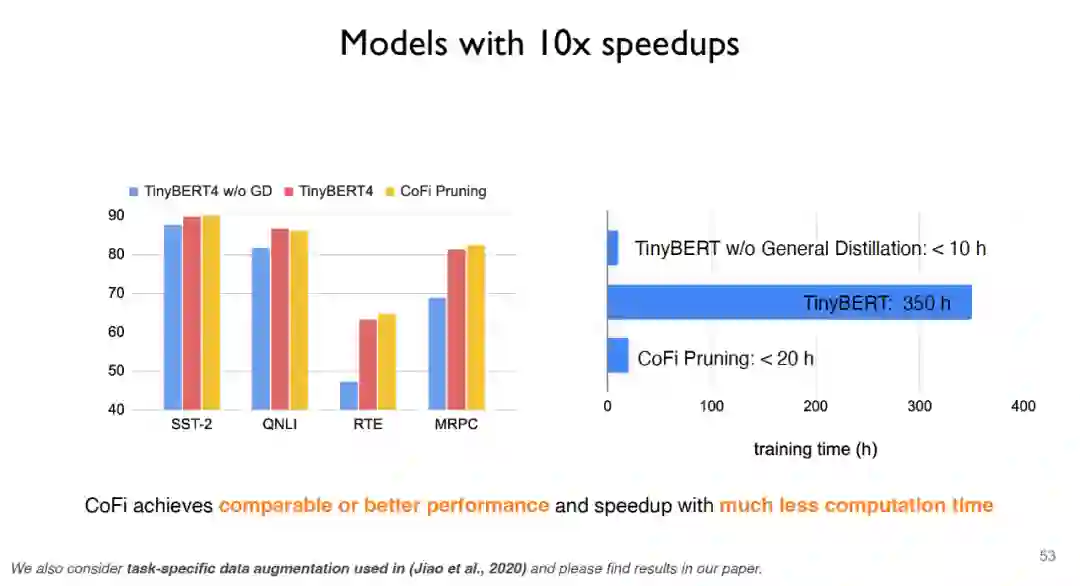 综上所述,CofiPruning是一种非常简单有效的模型压缩算法,通过对粗粒度单元和细粒度单元联合剪枝,结合逐层蒸馏的目标函数可以联通结构剪枝和知识蒸馏这两种算法的优势,从而实现更快的处理速度和更小的模型结构。针对模型压缩的未来趋势,陈丹琦还重点提及了是否能够对例如GPT-3这样的大型语言模型进行剪枝,同时是否能够对上游任务进行剪枝,这些都是未来可以重点关注的研究思路。