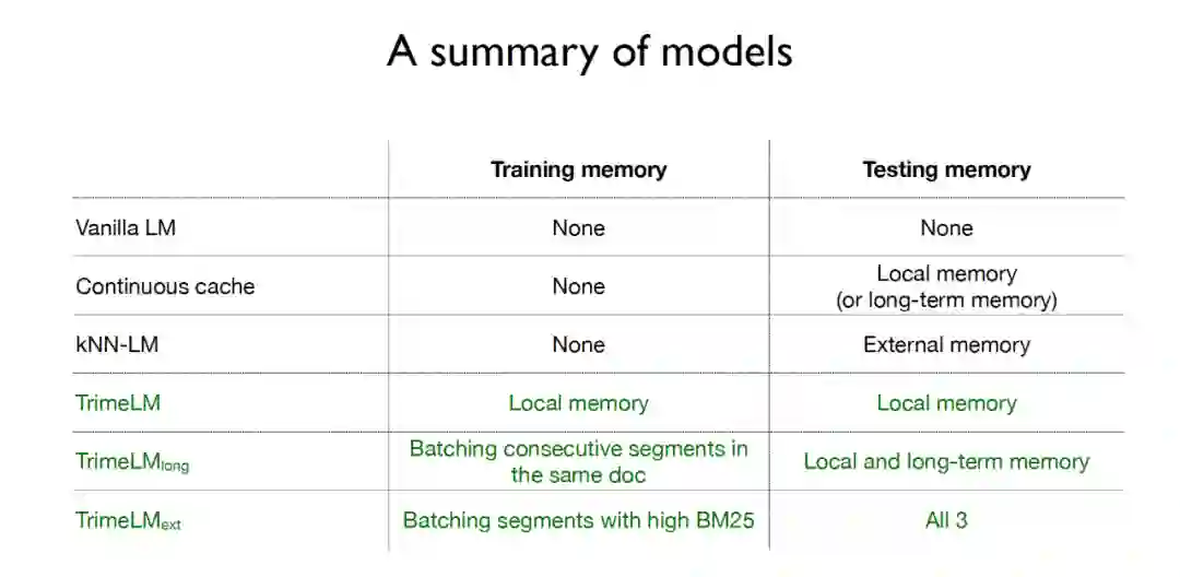 ;TrimeLMlong 针对长范围文本设计,类似于Transformer-XL;TrimeLMext结合了一个大型的数据存储区,类似于kNN-LM。