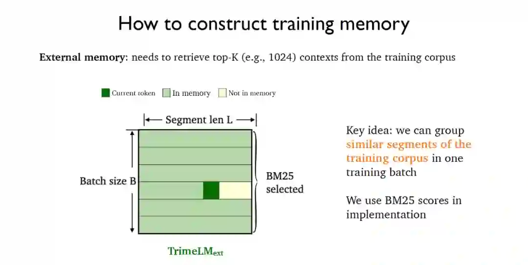 外部记忆需要结合大型数据存储区进行检索。为此可以利用BM25将训练数据中的相似片段放入同一个训练批中,这就得到了结合外部记忆的TrimeLMext模型。