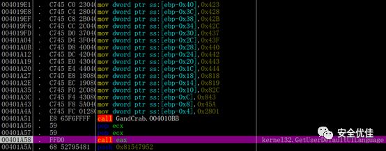 勒索病毒GandCrab 5.3运行后获取当前计算机语言,与病毒内置语言列表中的语言进行对比,如果本机语言在列表中则退出,不执行加密操作。