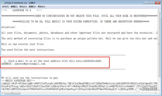 瑞星安全专家分析攻击者此次修改的原因有两种可能,第一种是部分受害者不知道如何访问病毒作者留下的暗网地址,所以无法与病毒作者取得联系,导致无法缴纳赎金;另一种情况是GandCrab 5.2之前版本的解密密钥托管在暗网服务器中,被欧洲多国警方合作追踪到了控制服务器,从而获取到了托管在服务器中的解密密钥,因此攻击者要求通过邮箱联系,可能是躲避追查。