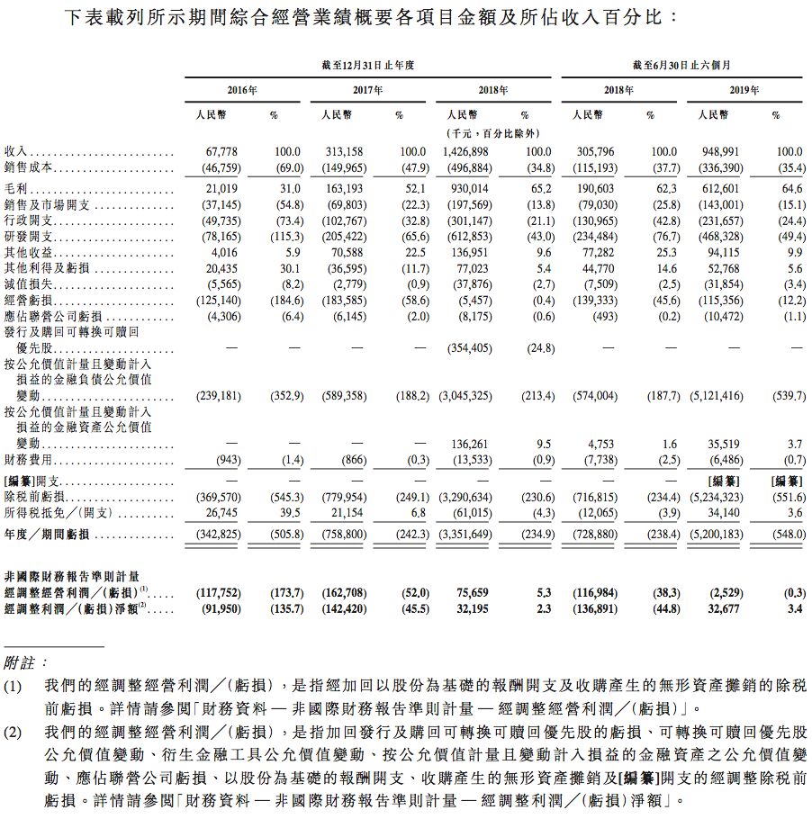招股书显示,旷视研发开支自2016年的人民币7820万元增加至2017年的人民币2.05亿元,在2018年进一步增加至人民币6.13亿元,分别占2016年、2017年及2018年总收入的115 .3%、65 .6%及43 .0%。旷视研发开支由截至2018年6月30日止六个月的人民币2.35亿元增至2019年同期的人民币4.68亿元,分别占该等期间总收入的76 .7%及49 .4%。
