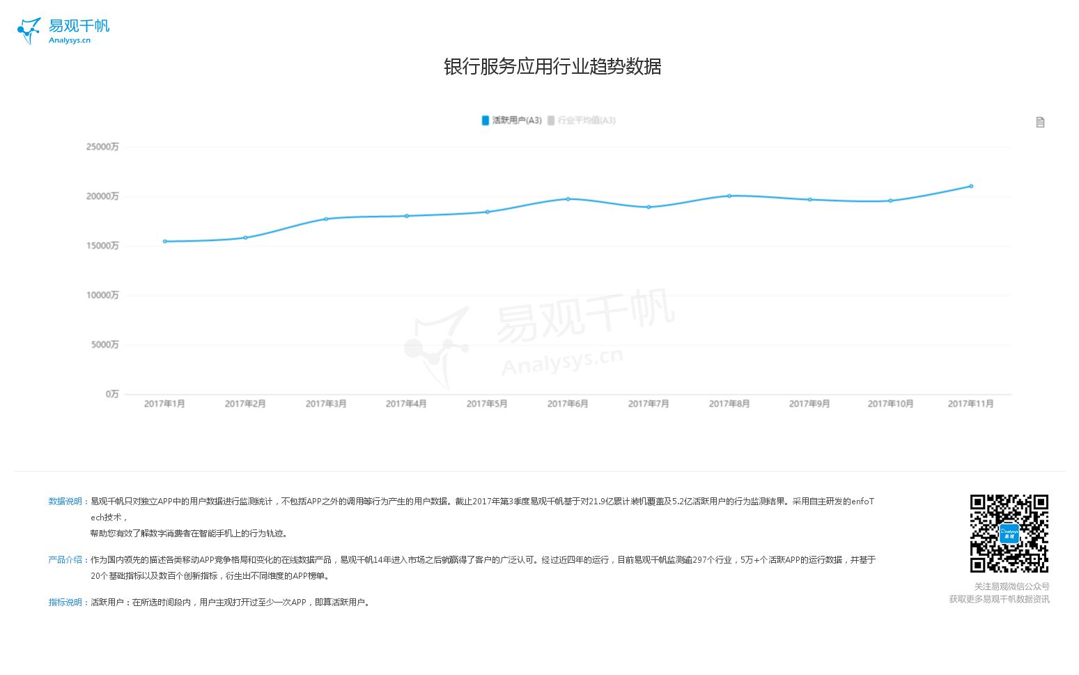 2017年11月,由于网络购物、营销活动力度加大等因素影响,银行服务应用APP活跃用户普遍上涨。根据易观千帆最新数据显示,2017年11月,银行服务应用领域活跃用户达21040.7万户,环比增长7.52%。