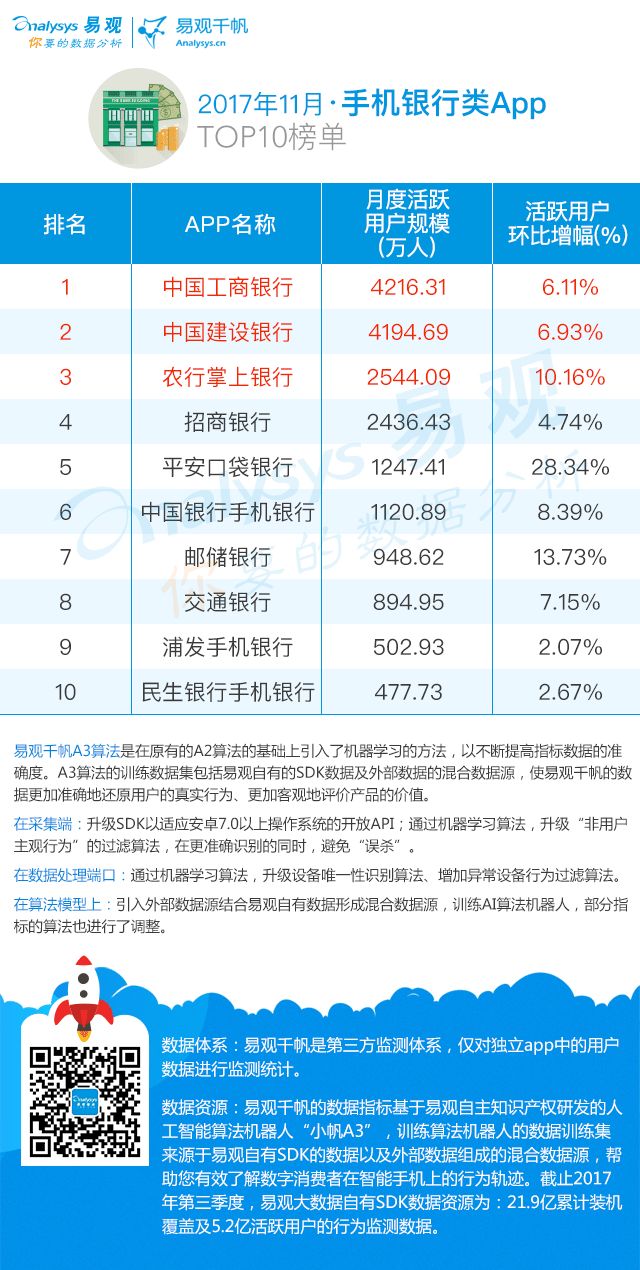 根据易观发布的2017年11月手机银行TOP10榜单显示,中国工商银行、中国建设银行、农行掌上银行分别以4216.31万、4194.69万、2544.09万的活跃用户位列前三甲。