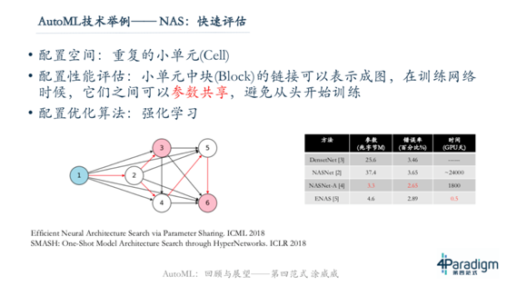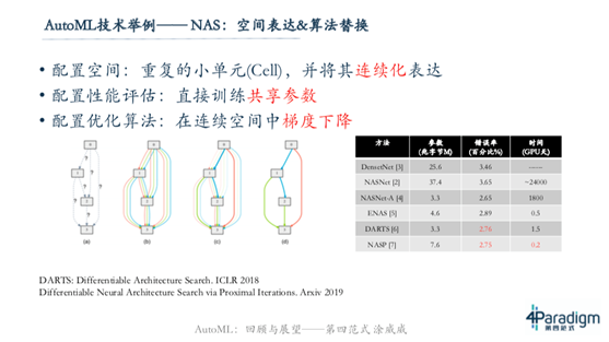 在网络架构(NAS 的配置)的性能评估上,在训练网络的时候,不同的网络配置之间可以参数共享,避免从头开始训练,通过这样的方式,效率提升了三个量级;最后,最新的一些方法将神经网络架构搜索的配置空间转换成连续化表达,就可以利用梯度下降的方法去优化,效率以及效果得到了进一步的提升。