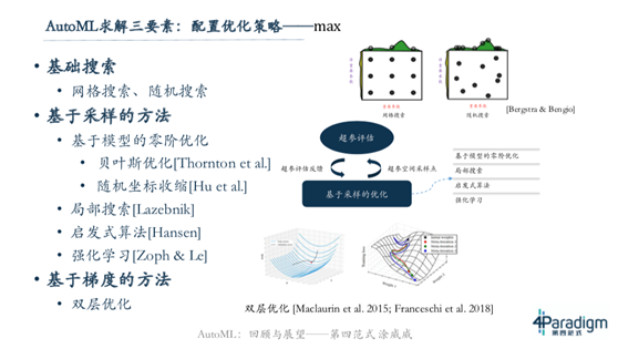 自动机器学习最经典的解法会尝试用基础搜索:网格搜索和随机搜索等方法去优化。这种方法非常简单,在实际应用中也很广泛,但是这类方法不会利用目标问题的特性,对于所有的问题都是一样的解法。还有一类更聪明的利用待解问题特性的方法:基于采样的方法。这类方法首先在配置空间里面采到一个点,然后进行评估并获得反馈,这个反馈慢慢地对要解的问题有更深的认识,可以利用问题特性更快地找到更适合的点。这里面有很多经典的方法,比如说像基于模型的零阶优化(比如贝叶斯优化、随机坐标收缩等)、局部搜索、启发式算法、强化学习等等。如果最终目标可以写出一个配置及其验证集效果之间解析表达式,那就可以利用基于梯度的方法更快速的进行优化,比如双层优化方法等,但是这类方法要求配置及验证集之间的关系可以写出解析表达式,这在实际应用中往往是不成立的,所以这类方法应用并不广泛。
