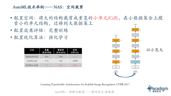 之后,很多研究对 NAS 进行了改进,主要体现在自动机器学习求解的三要素上:在配置空间上,有一些工作将大的结构裁剪成重复的小单元,在小数据集合上搜索小的单元结构,迁移到大数据及上,然后再进行与之前一样的做法,可以看到相比原来的方法,效率提升了一个量级;