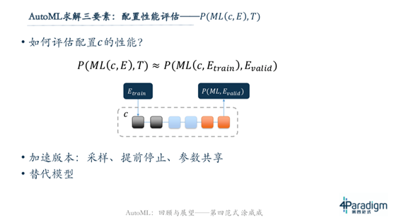 首先是配置空间,以经典机器学习过程为例,大多有三个核心步骤:数据预处理、特征处理和模型训练。数据预处理囊括了数据清洗、类型推断、样本选择、样本增强等。特征处理主要分为特征生成、特征选择两块,其中有各自不同的多种多样的方法。在模型训练方面,需要选择各种各样的模型算法,每个模型算法还需要对相应的学习参数进行调整。所以对自动机器学习而言,需要解决所有这些配置问题。可以看到这是一个随着配置数目指数增长的超大搜索空间。有了配置之后,需要对这个配置进行评估。机器学习最重要的指标是泛化性,就是要关注未来模型被应用到的样本上的性能。目前一般的性能估计算法是把数据切成训练集和测试集,利用训练集构建完模型,在测试集上进行验证,评估模型的泛化性能,但整个流程是非常漫长的。对于评估配置而言,整个评估的代价非常高。