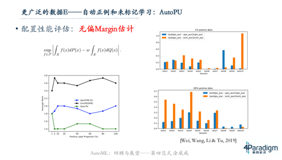 在有学者提出的 AutoSSL(自动半监督学习)中,基本思想是大间隔假设,意思就是如果某个超参数较好,其在未标记数据上的模型预测结果分类间隔较大,利用分类间隔来估计配置的性能可能会取得更好的效果,实际实验也发现这样能够取得很优异的效果。此外,在只有少量有标记样本且只有正例的情况下,如果还采用大间隔的方法,使得间隔的估计不准确。一些学者在这方面也做了大量的研究工作,提出了无偏的间隔估计方法,并取得了优异的效果。