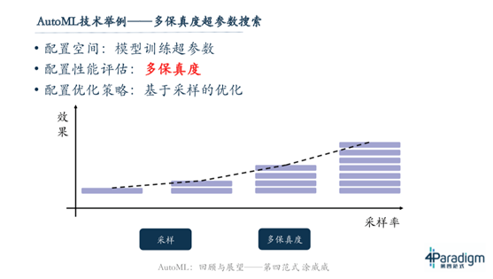 第一个是超参数搜索,它的配置空间是模型训练的超参数,配置的优化策略一般会采用基于采样优化,比如贝叶斯优化或者随机坐标收缩方法等。我们在前面提到,这里面比较关键的问题是每次做超参数(配置)性能评估的时候,需要把整个模型重新训练一遍,时间非常长。一种简单的加速做法是把这个数据进行采样,在很小的样本上面进行评估,或者采用提前停止的方法,虽然评估的很快(利用的资源很少),但是降低了准确性。就有学者提出了多保真度超参数搜索的方法,在效率和准确性之间做了较好的权衡