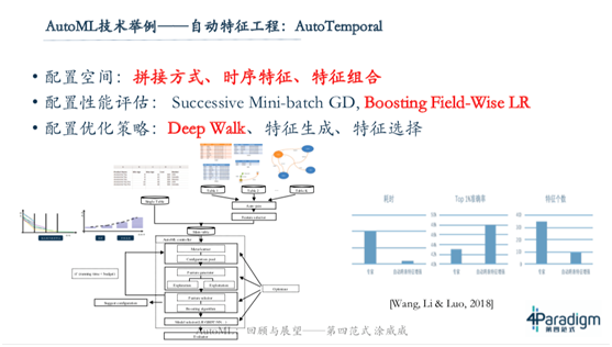 此外,在实际的业务当中,会碰到各式各样的数据,这些数据是以多张表的形式呈现的,但是机器学习算法只能接收一张表,而且实际业务会存在大量的时序特性,对自动机器学习而言,如何构建有效的时序的特征、将多表拼接成一张表的问题更为复杂,搜索空间要比自动特征组合更为巨大,第四范式有学者提出了 AutoTemporal 的方法,同样在性能评估、优化策略上进行了更加深入优化,并在实际应用中获得了很好的落地,相比专家做出的方案,利用了更少的特征,获得了更好的准确率,并在实际预测耗时上数个量级低于专家设计的方案。