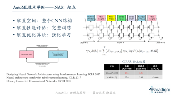 近期关于 NAS 的一些工作,是从 Google 的 2017 年的工作开始(其实几十年前也有类似的工作,具体可以参见第四范式的 AutoML 综述文章),当时 Google 的工作用 RNN 描述 CNN 的结构,利用强化学习去做超参数的探索,对探索出来的每个结构用完整训练的方式进行评估,效果已经逼近人当时设计的最好的结构,但这种方法消耗的时间和成本非常大。