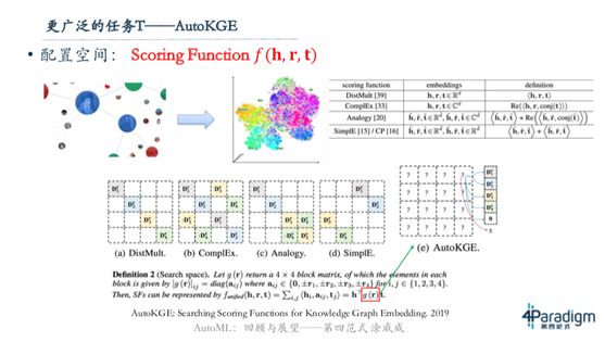 但机器学习算法只能接受向量化的表示,无法直接使用知识图谱,所以将知识图谱转化成向量化表示是关键,而知识图谱向量化表示的关键在于评分函数的设计,这些评分函数之前往往是人为根据不同的数据情况设计的。就有一些学者提出了 AutoKGE,将知识图谱的评分函数表示成 4×4 的矩阵这样一个配置空间,再经过一些巧妙的优化策略设计,获得了远超出人为设计的评分函数的效果。