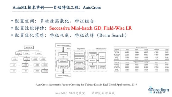 因此有学者提出了 AutoCross 方法,这类方法在搜索策略以及性能评估上做了专门的优化,比如利用 Beam Search 这样的贪心方法对特征组合空间进行探索,提出了 Successive Mini-batch GD, Field-Wise LR 可以并行的评估很多的特征组合,保证效果的同时,可以大幅提高评估效率。