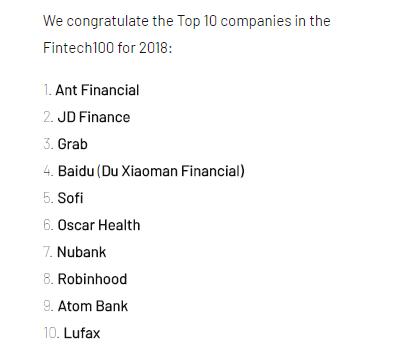 @全天候科技【2018全球金融科技100强:蚂蚁金服第一,京东金融第二】10月23日,毕马威联合澳大利亚知名金融科技风投机构H2Ventures在悉尼联合发布2018Fintech100年度报告,来自中国的新金融独角兽成为榜单的亮点。在TOP10中占据四个席位,蚂蚁金服位列榜首,京东金融位居第二,百度旗下度小满金融也排名第四,此外陆金所也位列榜单第十名。