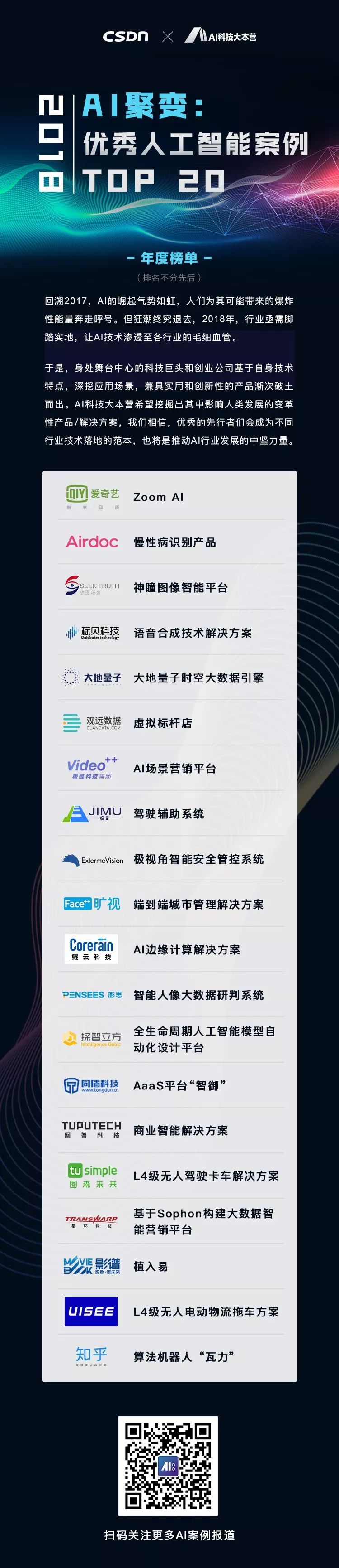 AI科技大本营从技术性、产品/解决方案创新性、行业发展前瞻性和竞争力、市场发展潜力等综合维度评估了这些申请案例,并最终评选出 2018 年优秀 AI 应用案例 TOP 20。我们相信,这些优秀案例的挖掘不仅会彰显 AI 技术价值,同时也会为不同 AI 行业领域的发展带来启迪。