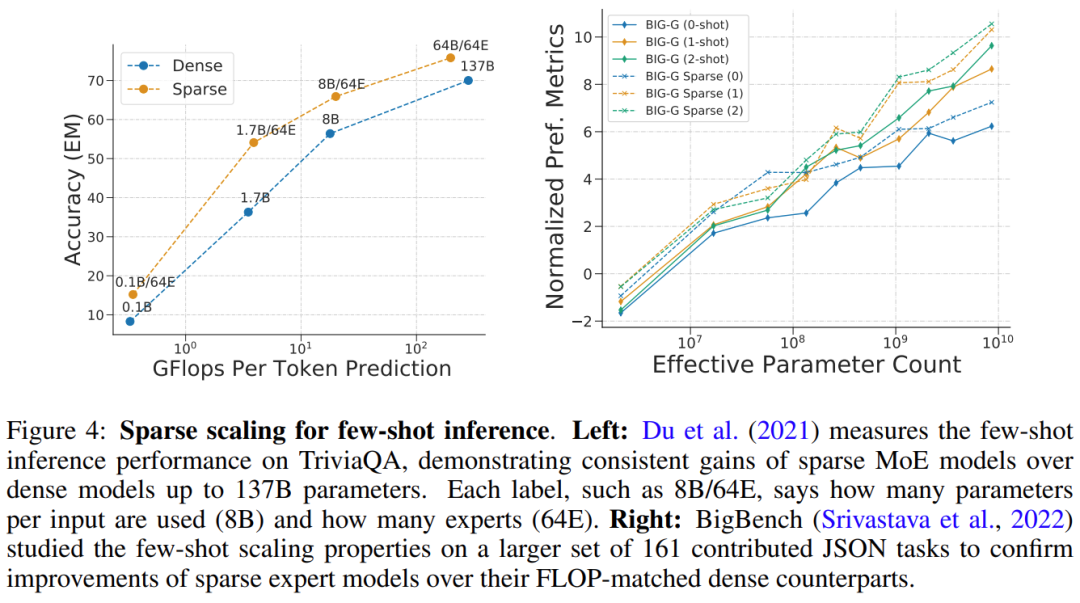 Du et al.(2021) 展示了稀疏 GLaM 模型的扩展,范围从 1B-64B FLOP,每个稀疏层使用 64 位专家。GLaM 取得了 SOTA 结果,在 zero-shot 和 one-shot 性能方面优于 175B 参数的 GPT-3 模型(Brown et al., 2020),同时在推理时每个token使用的 FLOP 减少了 49%,功耗降低了 65% (如下图4(左)所示)。下图 4 (右) 是稀疏模型在少样本推理上表现良好的另一个例子。