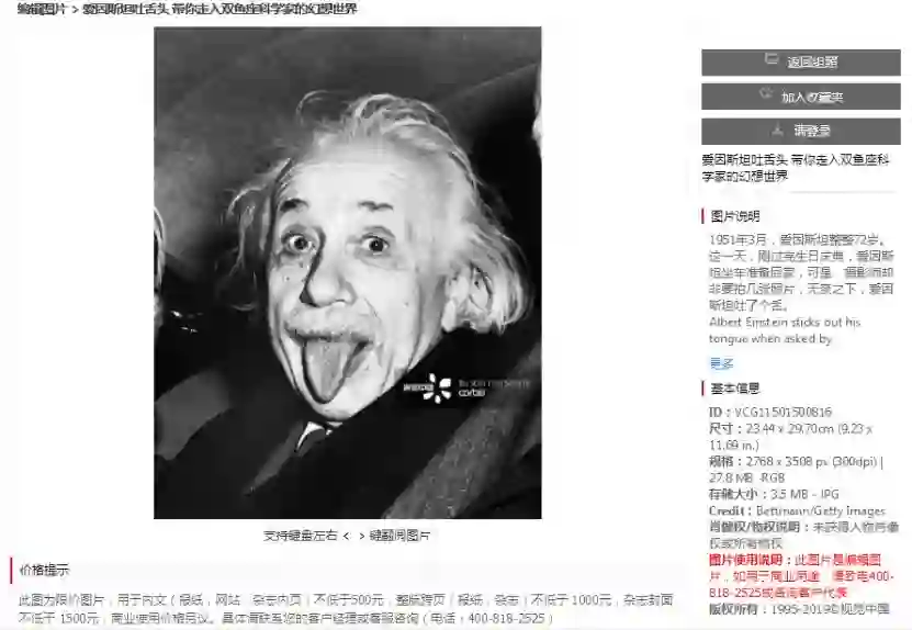 出于自保与风险防范,大家纷纷去查勘怎么回事,最后发现是一家叫“视觉中国”的公司,十分“机智”地将这张照片收录到了自家的图片库里,且被其申明版权,并在图片旁特别注明:此图是编辑图片,如果用于商业用途,请致电400-818-2525或咨询客户代表。