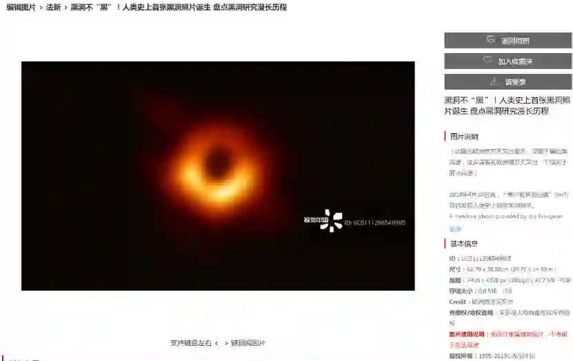 视觉中国创始人柴继军今天跟媒体说,这图是由欧洲南方天文台授权给他们的。可实际上,去到发布「黑洞照片」的源头——欧洲南方天文台(ESO)官网上,你不仅可以下载该照片TIF格式的高分辨率图片,人家还对版权做出如下申明: