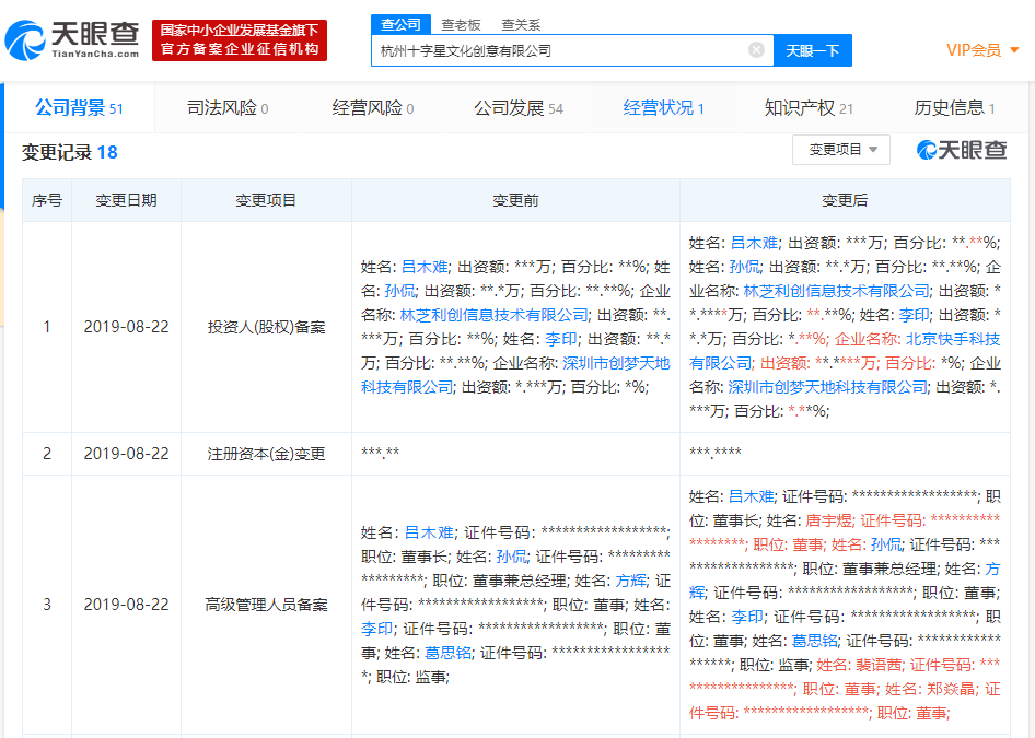 据36氪 近日,天眼查数据显示,动漫服务工作室——十字星的运营主体杭州十字星文化创意有限公司有多项变更记录,投资人(股权)备案新增北京快手科技有限公司,高级管理人员备案新增唐宇煜,而唐宇煜为快手创始人兼CEO宿华的妻子。杭州十字星文化创意有限公司成立于2016年10月28日,经营范围包括动漫设计、图文设计制作、影视策划等。