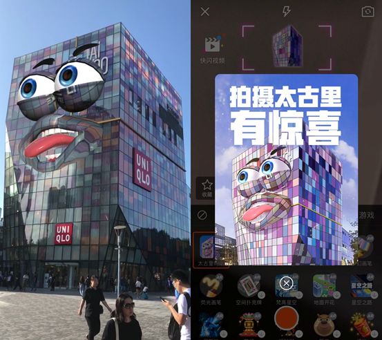新榜讯 9月4日,快手上线一款地标AR特效,用快手拍摄三里屯太古里,画面中建筑物瞬间变身“大眼萌”。