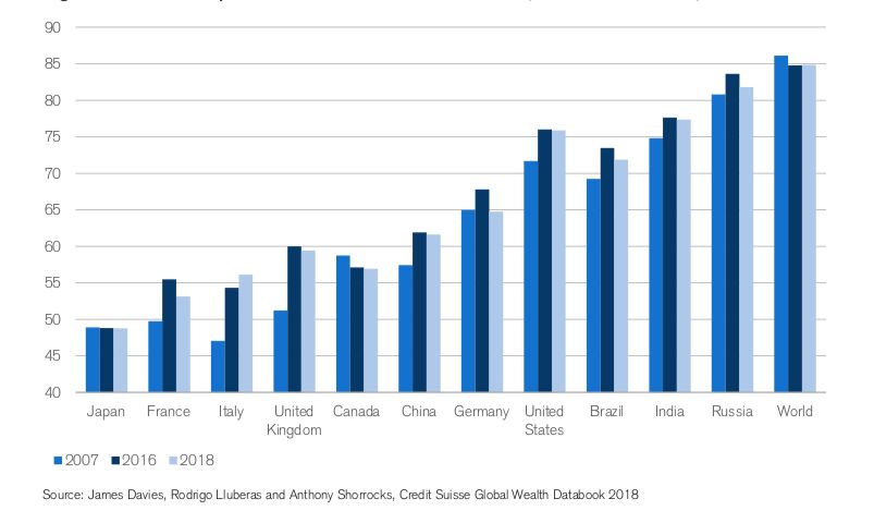 瑞信《Global Wealth Report 2018》,全球不同国家Top10%人群的财富占比