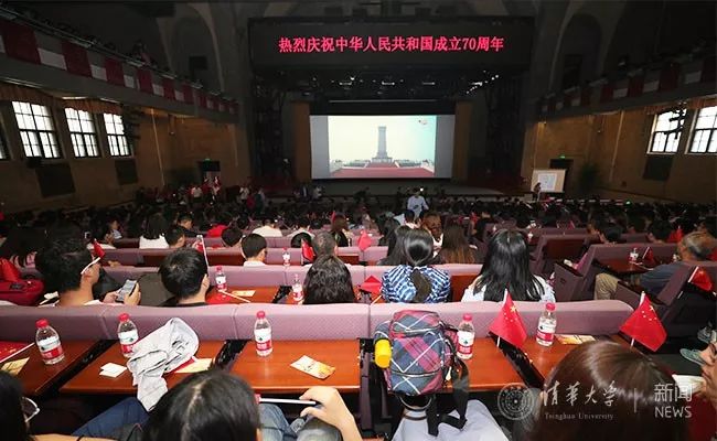 红日东升光芒万丈,五星红旗迎风飘扬。阔步行进在新时代的康庄大道上,我们迎来中华人民共和国成立70周年。10月1日上午10时,新中国成立70周年庆祝活动在天安门广场隆重举行,中共中央总书记、国家主席、中央军委主席习近平出席并发表重要讲话。清华大学党委书记陈旭、校长邱勇、副校长尤政等清华代表受邀现场观礼。当天上午,校领导王希勤、杨斌、李一兵、郑力、向波涛、彭刚,校务委员会副主任韩景阳,学校老领导方惠坚、何建坤、胡显章,以及教职工代表、学生代表共750余人齐聚大礼堂,满怀期待与激动之情,集中观看新中国成立70周年庆祝活动直播,回首祖国波澜壮阔的伟大征程,共盼祖国更加辉煌的美好未来。