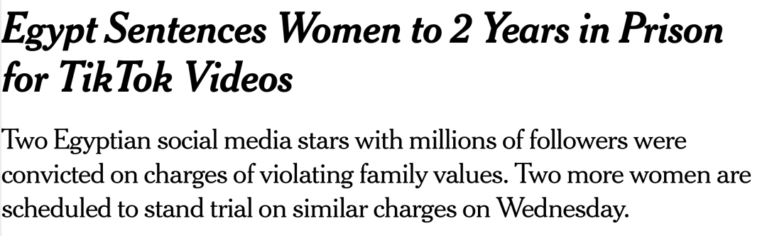 据纽约时报7月28日报道,两位埃及本土的网红被逮捕并被判处两年监禁。这是对自四月以来,抓捕的至少九名TikTok平台上女性网红的首次判决,她们的获罪理由是“违背家庭价值观”(violating family values)。