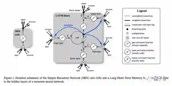 为了加强这种“记忆能力”,人们开发各种各样的变形体,如非常著名的Long Short-term Memory(LSTM),用于解决“长期及远距离的依赖关系”。如下图所示,左边的小图是最简单版本的循环网络,而右边是人们为了增强记忆能力而开发的LSTM。