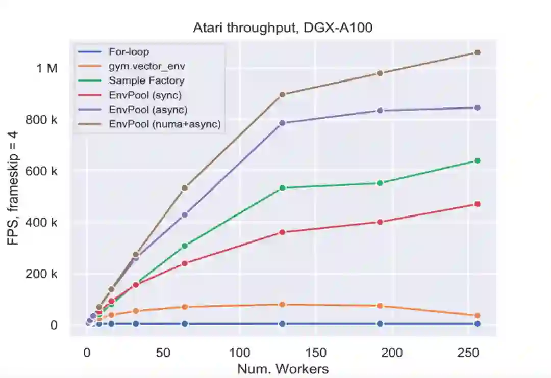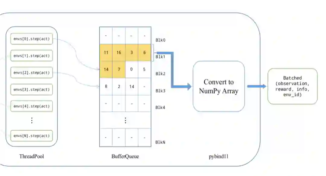 Sea AI Lab团队提出一个全新的环境模拟并行执行部件 EnvPool,使用 C++ 的线程池来异步执行 RL 环境,把 Python wrappers 整合到高速的 C++ 实现中