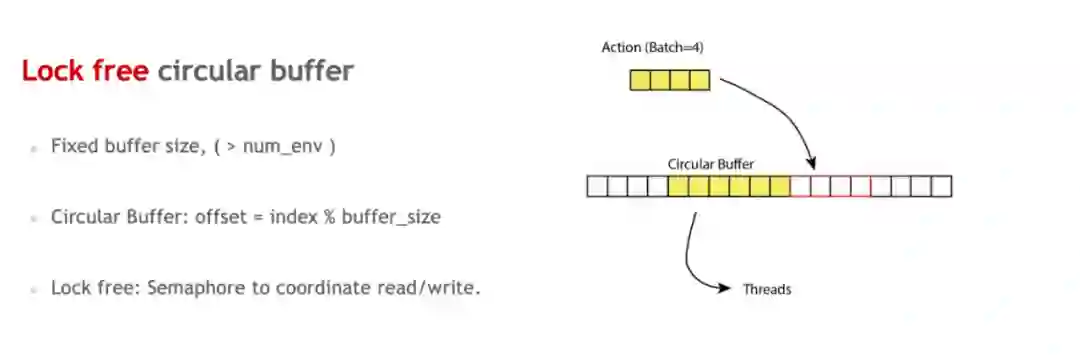 由于 EnvPool 假定同时并行的环境的总数是提前定好的,同时交互的 batch 大小也是提前预定的,因此在这个场景下可以使用比通用队列更定制化且更高效的队列的实现。ActionBufferQueue 是用于存储 Action 的队列,使用固定大小的循环内存,并用 semaphore 和原子操作来实现无锁的多线程读写。