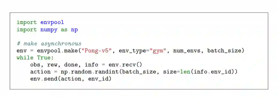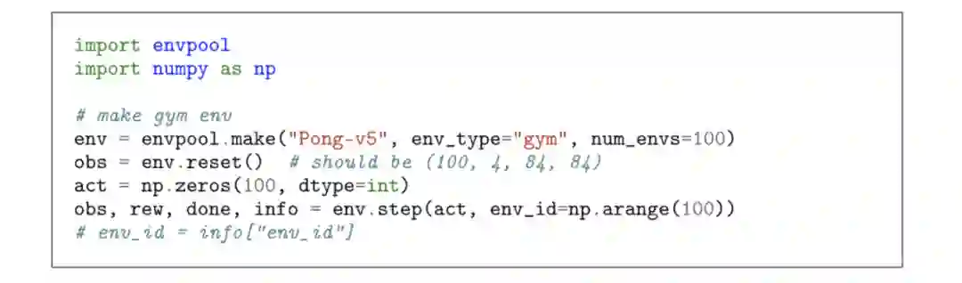 使用 C++ 定制实现的 EnvPool 对研究人员非常友好,在用户端的 Python 接口与 Gym API 接口保持一致,唯一的区别就是每一步的操作都是对一个 batch 的环境一起操作