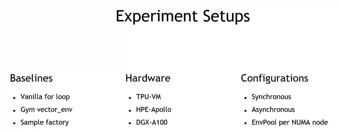 Sea AI Lab 团队在不同的硬件机器上对比了 EnvPool 与经典的环境并行执行引擎,比如前文提到的 gym.vector_env,及发表于 2020 年据团队所知是目前最快的 RL 环境执行引擎 Sample Factory。以下为实验设置: