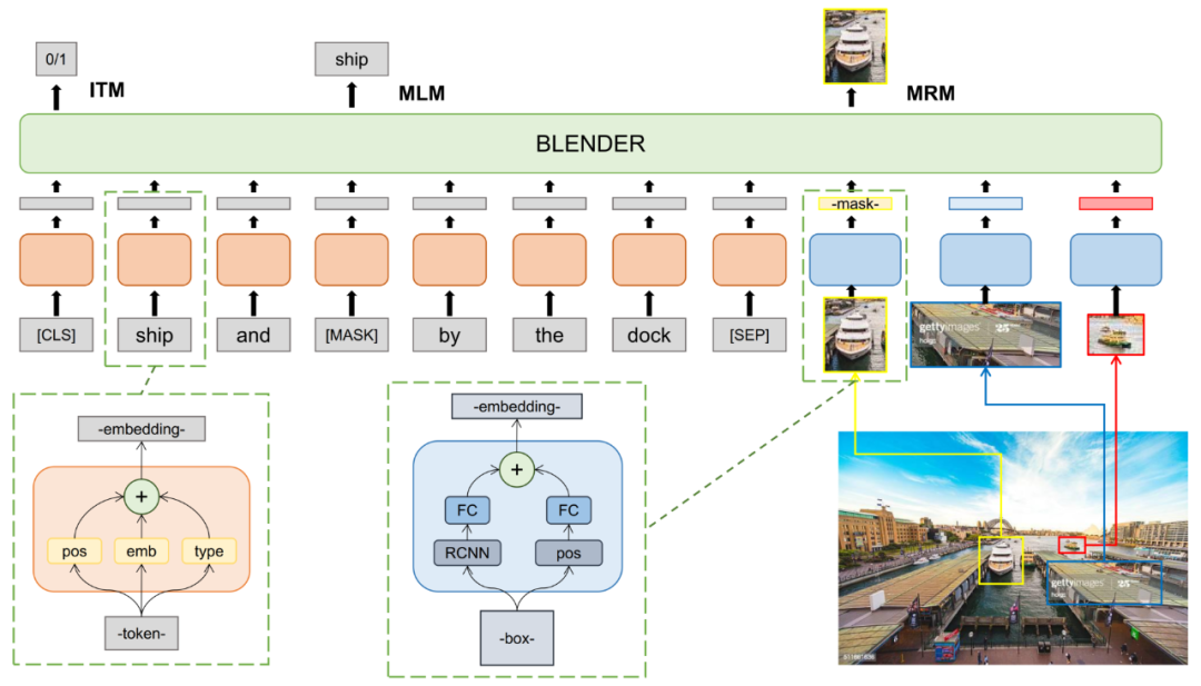 第一阶段在大约 150w 对图片及其描述的样本上进行预训练,采纳了 Masked Language Modeling (MLM), Masked Region Modeling (MRM)和 Image-Text Matching (ITM)三组预训练任务,如图所示。