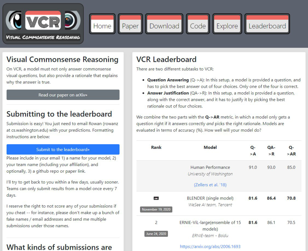 2018 年,来自华盛顿大学和艾伦人工智能研究所的 Rowan Zellers、Yonatan Bisk、Ali Farhadi、Yejin Choi 四位学者联合发起了一项 VCR 任务,该数据集包括 11 万个电影场景中的 29 万个多项式选择题,是当前图像理解和多模态领域层次最深、门槛最高的任务之一。