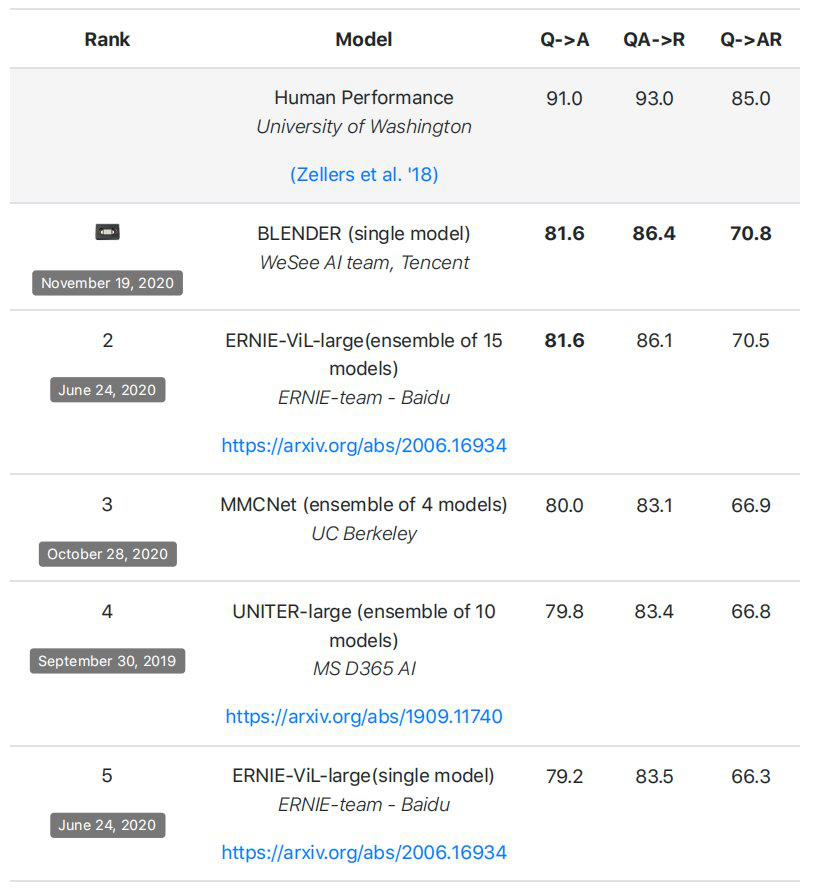 2020 年 11 月 19 日,腾讯微视「BLENDer」模型凭借「81.6,86.4,70.8」的成绩,登上了多模态领域权威榜单 VCR 的榜首。