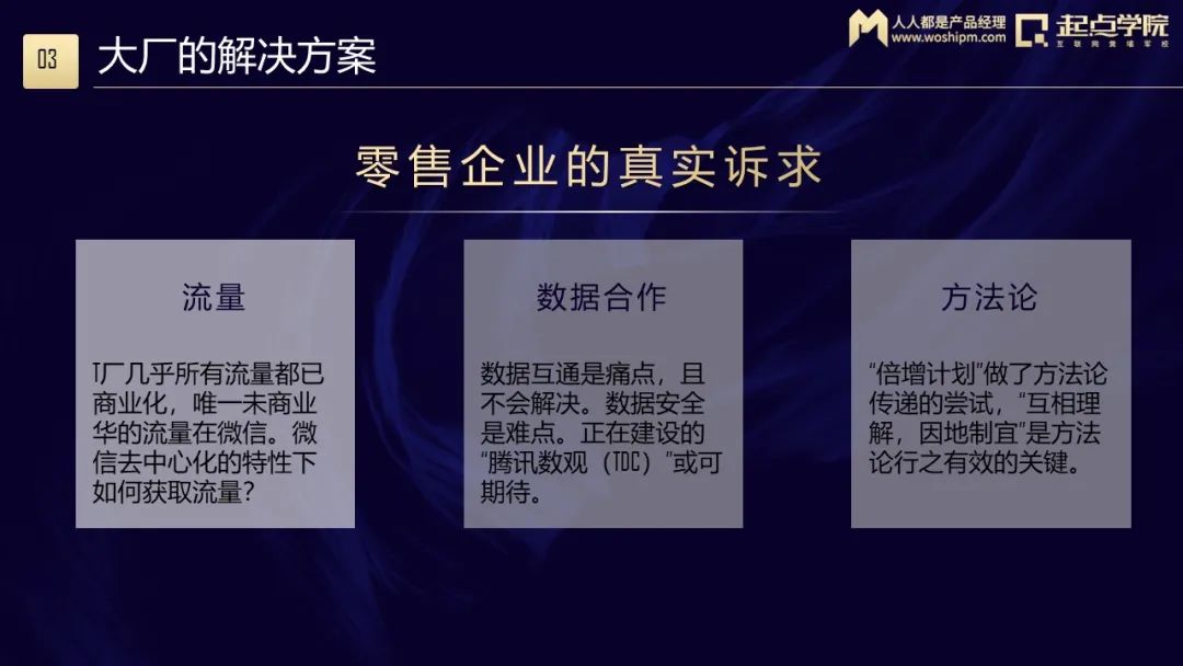 但是这里面存在一个问题:零售商对量是有渴求的——恨不得你那里有一个大水库,挖个渠把流量引过来。微信是有很多水,但它不是水库,它更像是瓢泼大雨,你想要得拿盆去接。