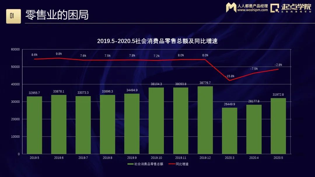 中国的社会品消费总额增速连年下降,这给零售业带来了很大的压力。零售业在线上的比例是连年递增的,这就意味着线下零售的空间被进一步压缩——特别是在疫情期间,3月份零售业总额同比下降了大概16个百分点。