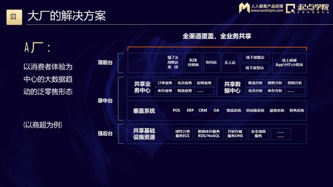以商超为例,A厂会提供一整套完整的前中后台——包括获客、中台、各种系统都提供,底层数据也帮你整合好了,还有一个及时有效的数据报表,让你随时随地掌握经营状况。