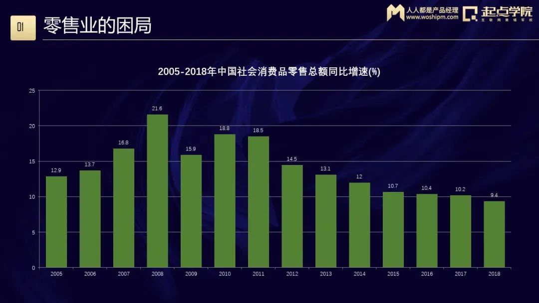 今天我从四个方面来分享,零售业面临的一些困局、如何破局、大厂在新零售行业的布局是什么样的、中小型企业会有什么样的机遇?