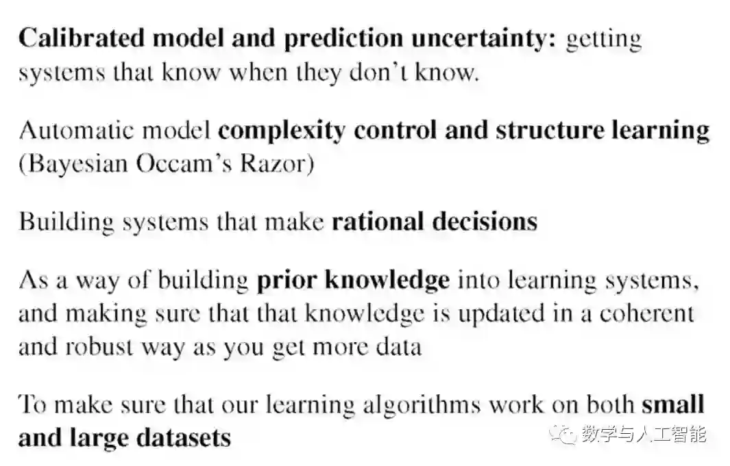 你可能会想,当前深度学习如此成功,基本上任何复杂任务都只需要套入这种端到端的方法就能取得不错的效果,那么我们还需要概率与贝叶斯法则吗?还是说贝叶斯法则只是 18 世纪的老旧研究而跟不上当前 21 世纪的深度方法?Zoubin 非常推崇为任务与模型引入概率,它展示了以下一些原因来说明为什么概率对于机器学习非常重要。
