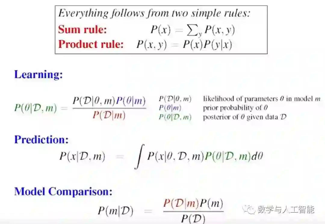 若将基本贝叶斯法则应用到机器学习中,我们就可以得到以下三个非常基础的方程,即学习、预测和模型对比。此外,值得注意的是,贝叶斯法则并不是最基本的公理,它是由由概率的加法原则与乘法原则组合而成。